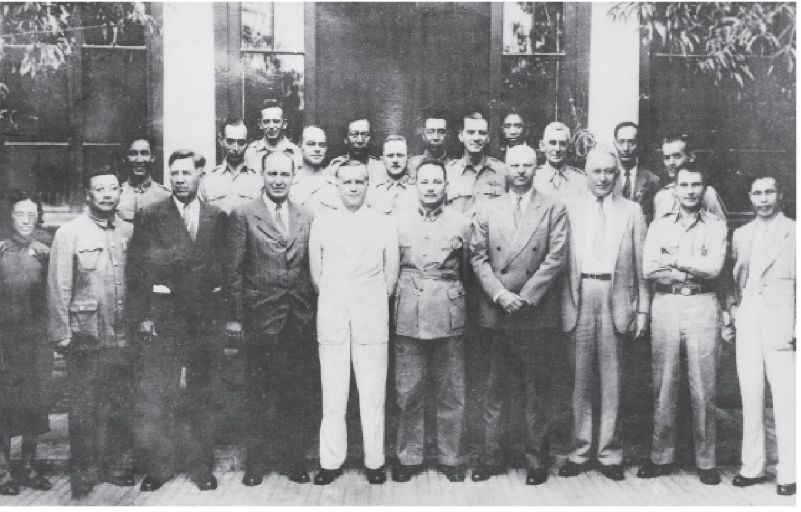 内容:1946年春,北平军事调处执行部中共方面代表叶剑英 (前排右五) 同执行部美方代表罗伯逊 (前排右六) 等人合影。